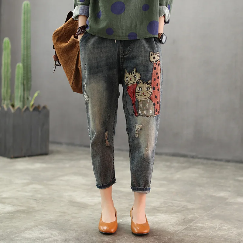 2019 Plus Size Ladies Loose Embroidered Cute Cat Jeans Women 2019 Summer Female Boyfriend Jeans For Women Clothes Denim Harem Pants From Qinsuang