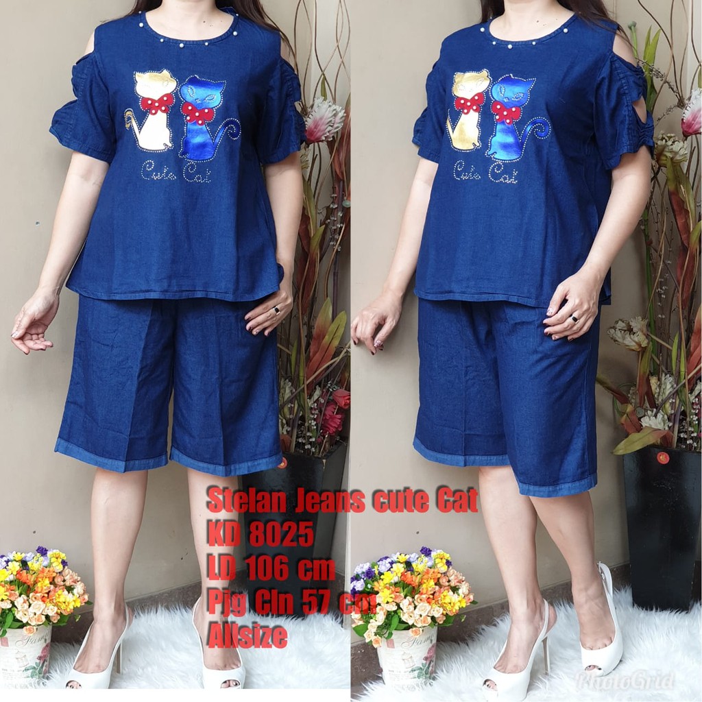 Setelan Jeans Wanita Setelan Muslim Lengan Bolong Cute Cat Kd 8025