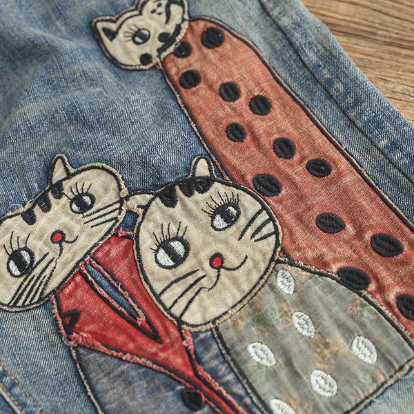 Plus Size Ladies Loose Embroidered Cute Cat Jeans Women 2019